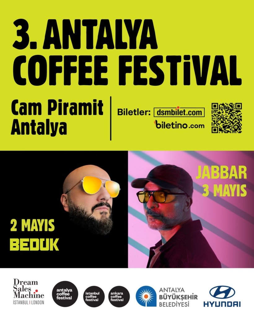 Antalya Büyükşehir Belediyesi’nin destekleriyle, Dream Sales Machine organizasyonuyla hayata geçirilen 3. Antalya Coffee Festival, 1–3 Mayıs 2026 tarihlerinde Cam Piramit’te kahve severlerle buluşuyor. Bu yıl festival sadece kahve deneyimiyle değil, aynı zamanda güçlü bir sosyal sorumluluk hikayesiyle de öne çıkıyor. Katılımcıların festival bileklikleri özel bir kutuda toplanıp fidan bağışına dönüştürülerek, her bilet doğaya bir katkı sunmuş olacak. Sahnede ise Bedük ve Jabbar festival enerjisini yükseltecek.